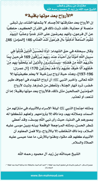 وقال سبحانه في حق الشهداء: ﴿وَلَا تَحۡسَبَنَّ ٱلَّذِينَ قُتِلُواْ فِي سَبِيلِ ٱللَّهِ أَمۡوَٰتَۢاۚ بَلۡ أَحۡيَآءٌ عِندَ رَبِّهِمۡ يُرۡزَقُونَ ١٦٩ فَرِحِينَ بِمَآ ءَاتَىٰهُمُ ٱللَّهُ مِن فَضۡلِهِۦ وَيَسۡتَبۡشِرُونَ بِٱلَّذِينَ لَمۡ يَلۡحَقُواْ بِهِم مِّنۡ خَلۡفِهِمۡ أَلَّا خَوۡفٌ عَلَيۡهِمۡ وَلَا هُمۡ يَحۡزَنُونَ ١٧٠﴾ [آل عمران: 196-197]، وهذه حياة أرواح برزخية لا يعلم كيفيتها إلا الله تعالى. وأخبر النبي ﷺ: أن أرواح الشهداء في أجواف طير خضر، ترد أنهار الجنة، وتأكل من ثمارها. وثبت لأرواح المؤمنين الصالحين مثل ذلك، فالأرواح بعد موتها باقية: إما أن تنعم، أو تعذب.