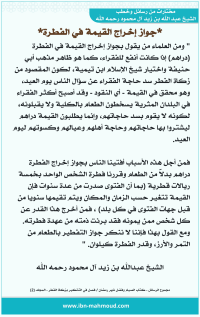 " ومن العلماء من يقول بجواز إخراج القيمة في الفطرة (دراهم) إذا كانت أنفع للفقراء، كما هو ظاهر مذهب أبي حنيفة واختيار شيخ الإسلام ابن تيمية، لكون المقصود من زكاة الفطر سد حاجة الفقراء عن سؤال الناس يوم العيد، وهو محقق في القيمة - أي النقود - وقد أصبح أكثر الفقراء في البلدان المثرية يسخطون الطعام بالكلية ولا يقبلونه، لكونه لا يقوم بسد حاجاتهم، وإنما يطلبون القيمة دراهم ليشتروا بها حاجاتهم وحاجة أهلهم وعيالهم وكسوتهم ليوم العيد. فمن أجل هذه الأسباب أفتينا الناس بجواز إخراج الفطرة دراهم بدلاً من الطعام وقررنا فطرة الشخص الواحد بخمسة ريالات قطرية (بما أن الفتوى صدرت من عدة سنوات فإن القيمة تتغير حسب الزمان والمكان ويتم تقيمها سنويا من قبل جهات الفتوى في كل بلد) ، فمن أخرج هذا القدر عن كل شخص ممن يمونه فقد برئت ذمته من عهدة فطرته. ومع القول بهذا فإننا لا ننكر جواز التفطير بالطعام من التمر والأرز، وقدر الفطرة كيلوان. "