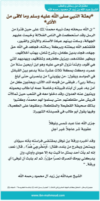 " إن الله سبحانه بعث نبيه محمدًا ﷺ على حين فترة من الرسل وقد استحكمت في الناس الضلالة وخيمت عليهم الجهالة، وسادت بينهم عبادة الأصنام والأوثان والقبور، فأنقذهم الله ببعثته وبركة رسالته، فجاهد في الله حق جهاده، فجاء بدين كامل، وشرع شامل، يهذب أخلاقهم، ويطهر عقائدهم، ويزيل كفرهم وشقاقهم، ويهديهم للتي هي أقوم، وابتدأ نزول الوحي عليه وهو ابن أربعين سنة من عمره، ومكث بمكة ثلاث عشرة سنة يدعو بين القبائل في المواسم ويقول: «من يؤويني؟ من ينصرني حتى أبلغ رسالة ربي؟». فيلقى من قومه أشد الأذى، ويعذبون كل من آمن به، غير أن أبناء قبيلته وخاصة عمه أبا طالب يحمونه ويذبون عنه العدوان، وقد دخلوا معه في الشعب حين تمالأت قريش على مقاطعتهم حتى يسلموا لهم محمدًا، وكتبوا بذلك صحيفة القطيعة والمقاطعة، وعلقوها على الكعبة، وفيها يقول أبو طالب في قصيدته الشهيرة: جزى الله عنا عبد شمس ونوفلاً عقوبة شر عاجلاً غير آجلِ وقد أخبره ورقة بن نوفل بمقتضى فراسته بأنه سيؤذى ويمتحن ويخرج من بلده، فقال: «أَوَمُخْرِجِيَّ هُمْ؟». قال: نعم، إنه لم يأت أحد بمثل ما أتيت به إلا عودي وأوذي، وإن يدركني يومك أنصرك نصرًا مؤزرًا. ثم لم يلبث أن توفى؛ أي ورقة. "