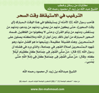 فأحب رسول الله ﷺ لأمته أن يستيقظوا في هذا الوقت الـمبارك (أي وقت السحور)، حتى يكون منهم من يصلي، ومنهم من يدعو، ومنهم من يستغفر، ومنهم من يتلو القرآن، وحتى لا يكونوا من الغافلين. فسماه السحور الـمبارك من أجل ذلك. ومن أجل أن الله وملائكته يصلون على الـمتسحرين. وهذه فضيلة عظيمة، ويتبعها ما هو أفضل منها، وهو شهود الـمتسحرين لصلاة الفجر في جماعة، والذي ورد في فضله أن رسول الله ﷺ قال: «مَنْ صَلَّى الْفَجْرَ فِى جَمَاعَةٍ كَانَ كَقِيَامِ لَيْلَةٍ كله» وقال: «مَنْ صَلَّى الْفَجْرَ فِى جَمَاعَةٍ كَانَ فِي ذِمَّةِ اللَّهِ حَتَّى يُمْسِيَ».